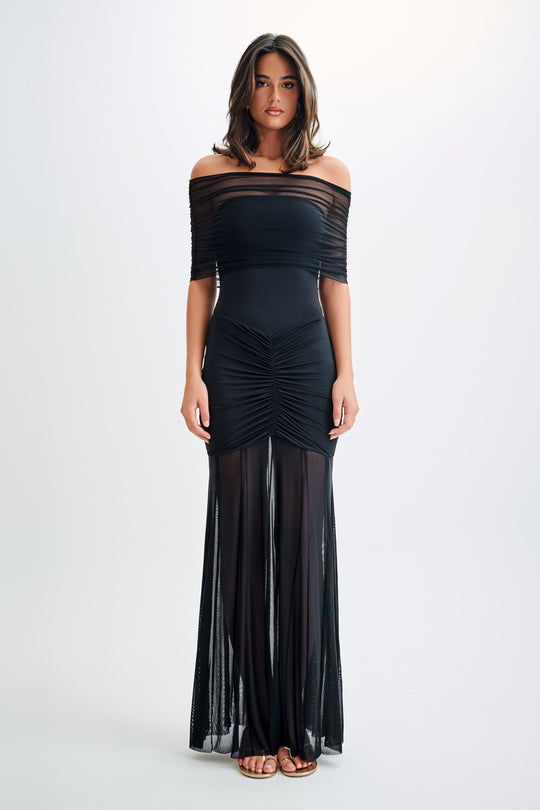 Caspian Slinky And Mesh Off Shoulder Maxi Dress - Black